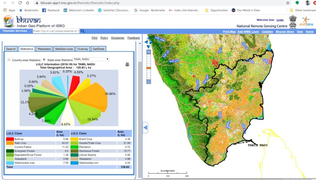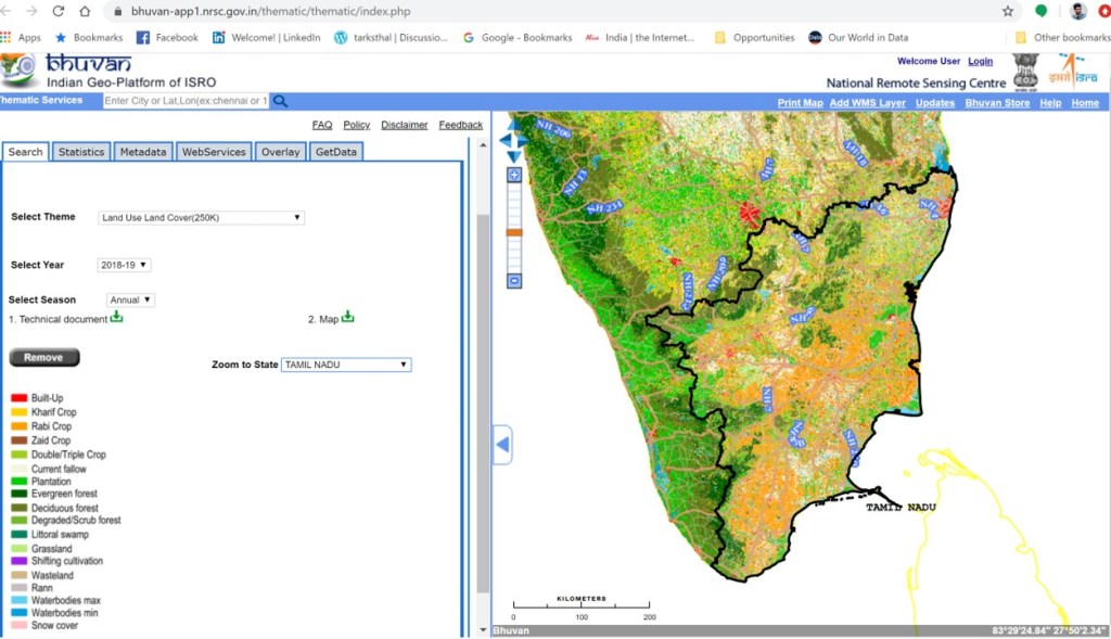 The Bhuvan Thematic Services facilitate the users to select, browse and query the Thematic Datasets from this portal. Users can consume these Thematic Datasets and integrate into their systems as OGC Web Services. Once of these datasets include the spatial-temporal variations of Land Use Land Cover (2005-06 onwards) at scale of 1:250,000.