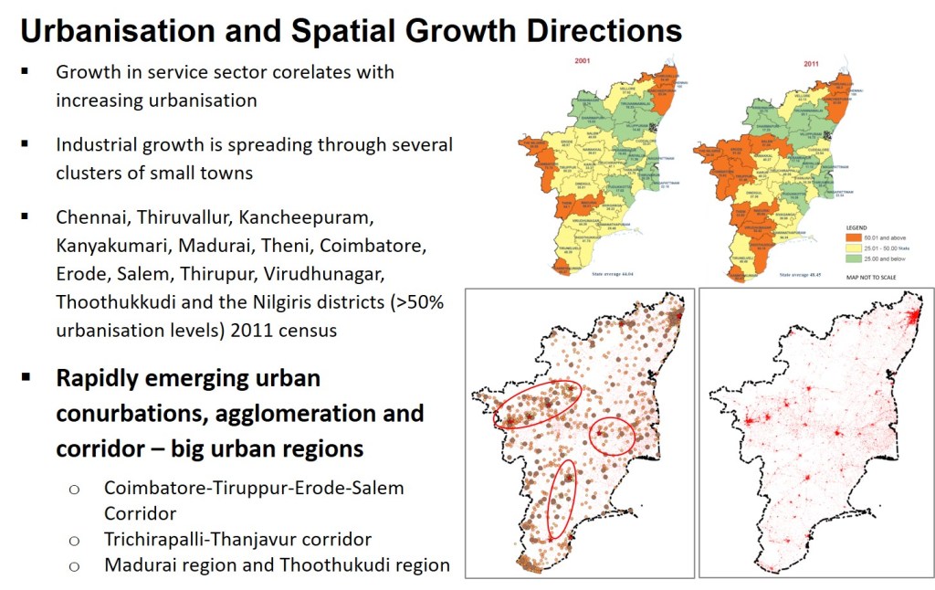 The fast rate of urbanization has triggered conurbations, agglomeration and corridor development leading to big urban regions within the state. For example, Coimbatore-Erode-Salem Corridor has been on the limelight because of heavy industrial development and emerging as a big industrial investment hub. Similarly, Trichirapalli-Thanjavur corridor, Madurai region and Thoothukkudi region are also emerging rapidly.