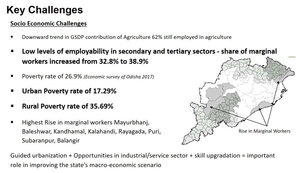 It is dichotomous that Odisha being a mineral, soil, and water rich state still fares at 23rd rank among other states and union territories in India with 32.59 per cent people below poverty line as of 2011-12 reducing from 57.61 per cent (click here to read more). The Economic Survey of Odisha (2017-18) estimates that the poverty rates have further reduced to 26.9 per cent by 2017. It is important to note that the incidence of poverty is much lower in urban areas (17.29 per cent people below poverty line) as compared to rural areas (35.69 per cent people below poverty line).