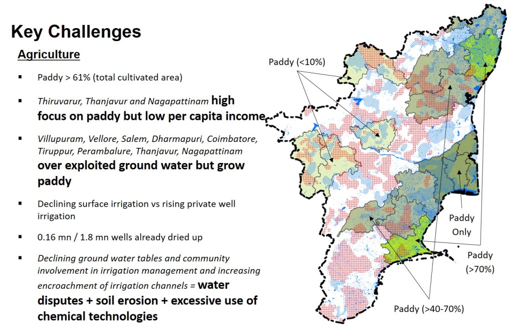 Paddy occupies more than 61 per cent of the total cultivated area of Tamil Nadu and is cultivated in three seasons (April-July, August-November and December-March). The average yield rate has been 3070 KG per hectare. Of the 32 districts, except Chennai which does not cultivate paddy and Nilgiris which has less than 1 % under paddy, rest of the districts cultivate paddy. Thiruvarur, Thanjavur and Nagapattinam are the three major districts with 1.66, 1.62 and 1.57 lakh hectares under paddy and rank low 30, 23 and 27 in terms of per capita income, respectively. Kancheepuram and Ramanathapuram have more than 70 per cent of area under paddy. Thiruvallur, Villupuram, Thiruvannamalai, Pudukkottai, Madurai and Sivagangai have more than 40 per cent of the cultivated area under paddy. Whereas Namakkal, Krishnagiri, Coimbatore and Tiruppur have less than 10 per cent of total cultivated area under paddy. Villupuram, Vellore, Salem, Dharmapuri, Coimbatore, Tiruppur, Perambalure, Thanjavur, Nagapattinam are over exploited in terms of ground water and paddy is a hydrophilic plant and requires standing water.