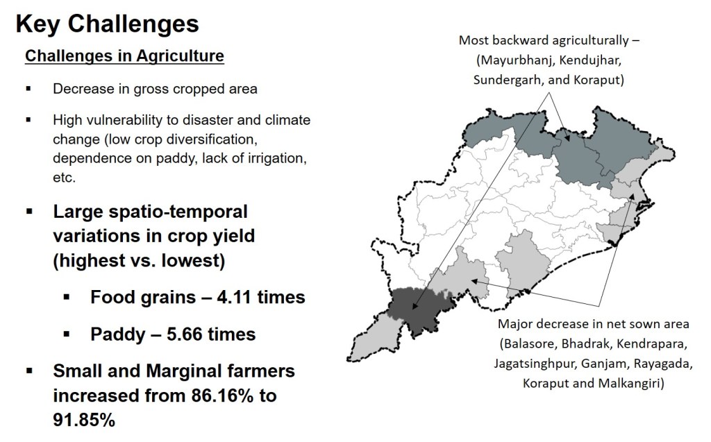 The agricultural growth rate of Odisha, has been lower than that of India over the past two decades, due to low crop diversification, high concentration on paddy cultivation, and low proportion of irrigation and other productivity enhancing inputs including mechanization and optimized utilization of fertilizers for agriculture as compared to other states.