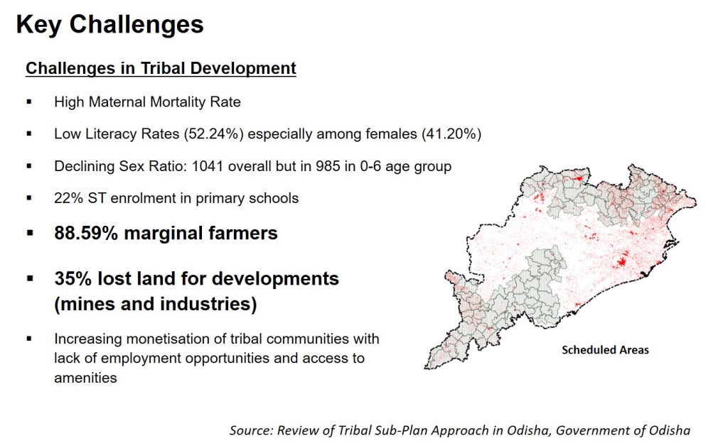 Even after 60 years of tribal development interventions, there are huge gaps in developmental indices between the tribal and general population both at the national and state levels. As per a UNICEF report, the maternal mortality rate in the SC/ST population in Odisha stands at a high of 67 per cent against 55 per cent at the national level. A World Bank report reveals anti-poverty programme awareness among tribal in Odisha is significantly lower than in Madhya Pradesh and Karnataka. ST enrolment in primary schools stand at a low of 22 per cent in 2007-08. As per FAO report, 35 per cent of ST households (farmer) of Odisha are buried in debts. As many as 78 per cent of ST households are in food inadequacy category against 50 per cent in the general category as of 2009 (Review of Tribal Sub-Plan Approach in Odisha, Government of Odisha).