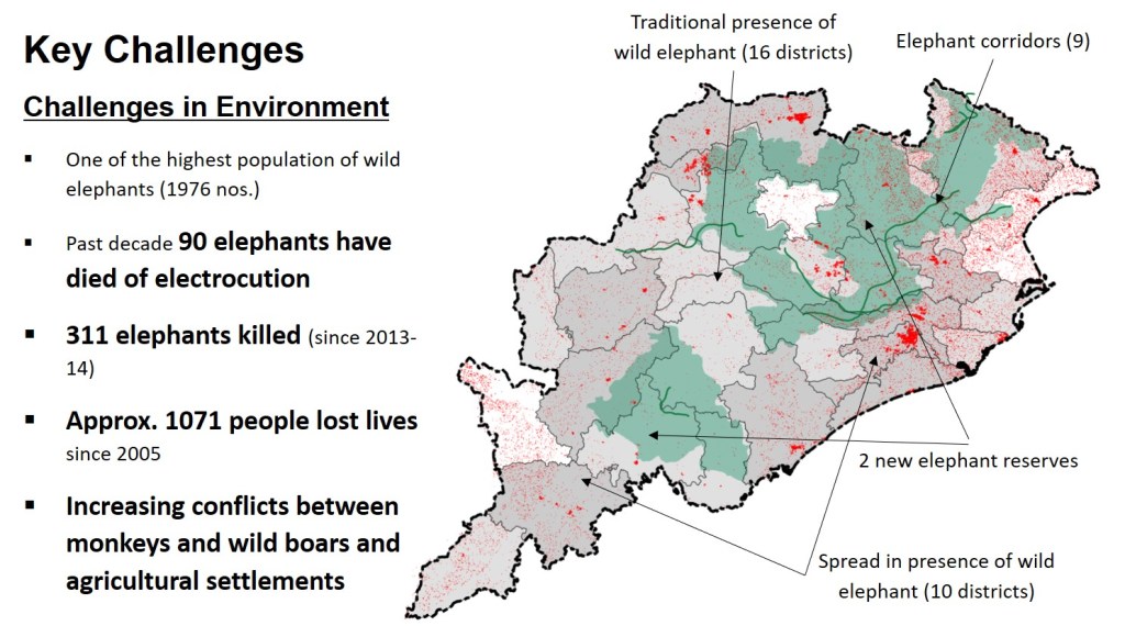 Furthermore, most of these protected and eco-sensitive areas are interspersed with settlements. Traditionally wild elephants were known to be present in 16 districts and they have further spread to 10 more districts leaving only Baleshwar, Bhadrak, Debagarh and Nabarangpur. (see image below) Conflicts with monkeys and wild boars and agricultural settlements are also increasingly becoming a cause of concern.