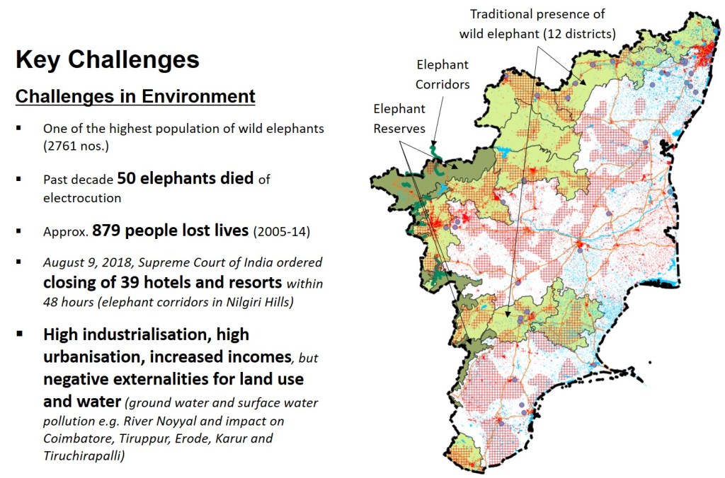 Dark green areas in the image show Elephant reserves, whereas light green areas show the districts with traditional presence of wild elephants. Note the critical aquifer areas (red hatches) formed by overexploitation due to agriculture conflict with traditional habitats of wild elephant. Also note how the elephant corridors pass through them. Furthermore, note how the settlement pattern (red colour) with heavy industrialisation and the urbanisation corridors (red colour along red line) conflict with waterbodies (blue) resulting in depletion (red hatch) as well as pollution of rivers.